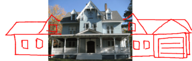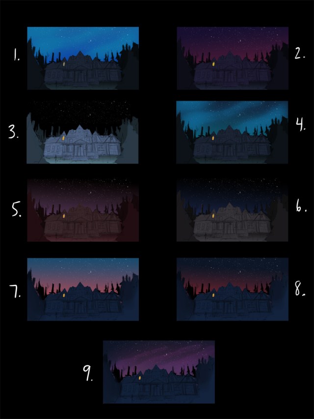It started with a brief: we wanted “the house surrounded by trees, silhouetted on a hill against the dusk light.” We also sent along a really rough drawover based on the layout of the house in the game, over top of an image of an old Victorian that Karla found online.