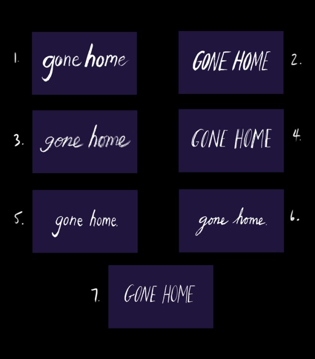 Similarly we settled on options 3 and 4 from the logo sketches. They’re very different, but both communicate a kind of handmade, careful-but-imperfect approach that gives them an intimacy and innocence we liked. We ended up using 3 in the final piece because it just meshed so well with the dusting of stars that Emily worked into her finished painting. Logo 4 will find its way into the game eventually, though.