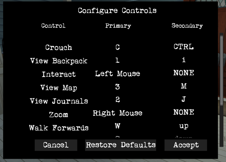 The last piece of the puzzle is dealing with a different sort of input entirely, such as a gamepad. Instead of pressing “c” to crouch, we want to be able to click the left stick, and instead of clicking the mouse button to interact, we want to be able to press the big green A button. Which sounds an awful lot like remapping controls! Except it’s every control, and we want to be able to switch back and forth at will. Gone Home deals with this by having a pre-set group of KeyMappings that we switch in and out on demand, called a ControlScheme. We keep at least four versions of this: the defaults for keyboard/mouse and gamepad, as well as user-remapped versions of each (we don’t want to lose your custom keybindings if you try the gamepad!). Because we want these bindings to last between play sessions, we save these out to disk in files. That means that switching between keyboard and gamepad, or reloading the default keybindings, is as simple as deserializing a file.