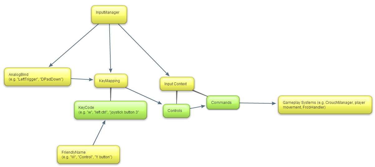 Those abstractions explain how we deal with the player attempting to frob objects when the game is paused, or how we might change the crouch button to stand up when the player is already crouched. In order to answer the questions of how the game deals with remapping buttons, though, there are yet more abstractions!